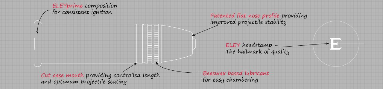 ELEY team features the patented flat nose bullet and trimmed down case technology to ensure consistent performance in every round.