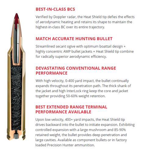 Loaded with the most advanced all-range hunting bullet available, Precision Hunter Ammunition sets a new standard of accurate, deadly and dependable hunting performance. Your trophy has never been closer– even if it’s far away! Featuring the radically superior ELD-X bullet with patented Heat Shield tip, Precision Hunter will soon be the “go-to” load for ANY hunting situation because of its effective terminal performance at ALL practical ranges.