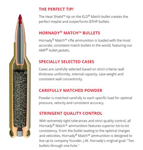 We carefully select every component to ensure uniformity, then load to exacting specifications to provide pinpoint accuracy. Each cartridge is loaded with either Hornady® A-MAX® bullets, our high-performance boattail hollow points, or the new, radically superior ELD® Match bullets. Stringent quality control ensures proper bullet seating, consistent charges and pressures, optimal velocity, consistent overall length and repeatable accuracy.