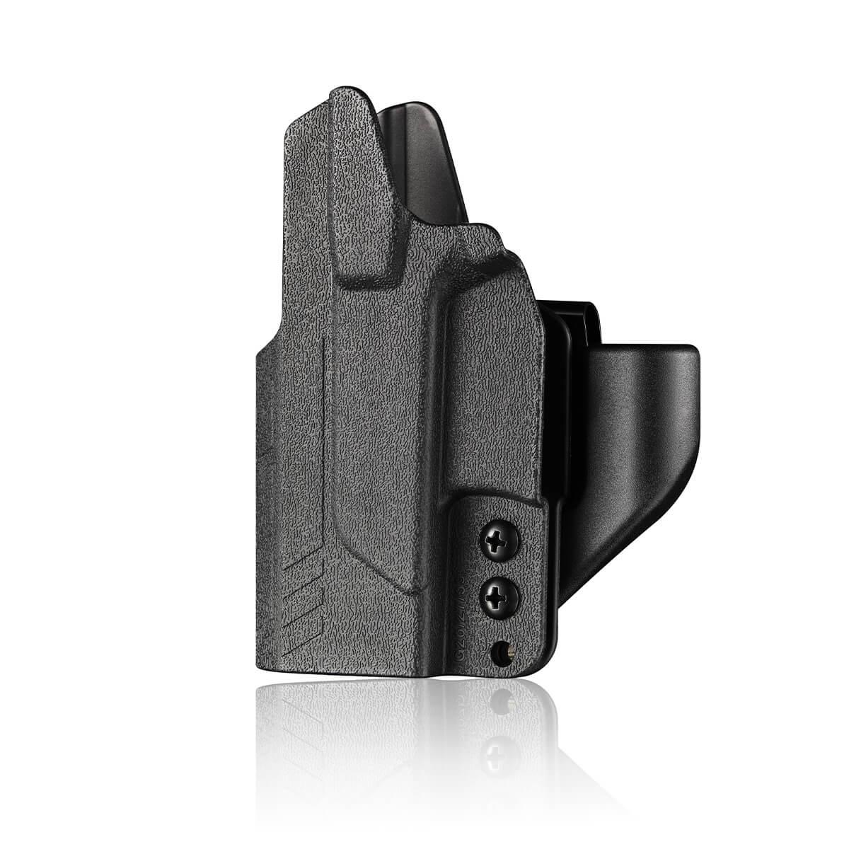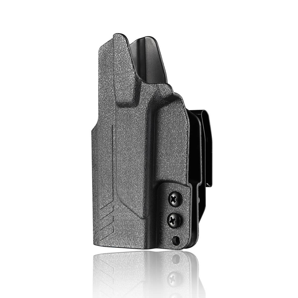 Designed with a high holster shield that keeps the gun slide from touching your body and sweat from touching the slide. State of the art design, injection molding and space age high-density plastics are combined to create a holster which cannot be duplicated in leather or any other material at a really affordable price. This is a great holster for the price. Solid design, tough/durable, lots of features, very versatile holster.