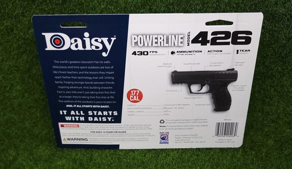 The Daisy Model 426 CO2 Air Pistol shoots BBs and features a built-in 15 round BB magazine. This CO2-powered air pistol is lightweight and dependable.