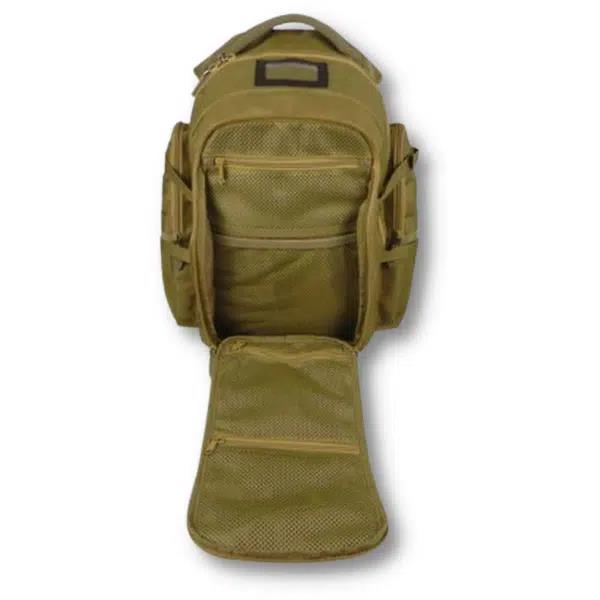 he EcoEvo Tactical Backpack – TAN offers closed-cell foam padded shoulder straps and a comfortable neoprene handle. With a lockable main compartment and lockable front pocket, this backpack offers convenient and secure storage for your items. This backpack boasts convenience and efficiency, with a Molle system for any accessories, pouches, and hooks, as well as a hydration pocket.