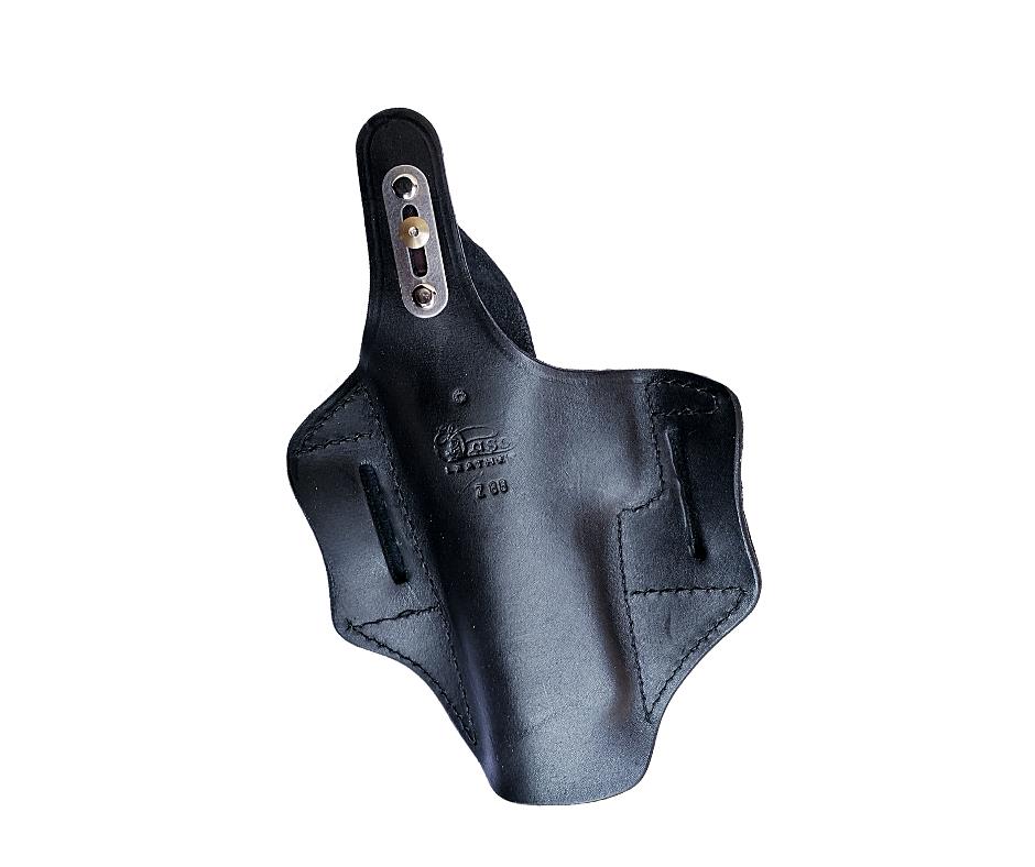 These holsters ride very high and their reduce bulk increase concealment of large handguns. Wet pressure moulded on accurate gun replicas for the perfect fit. Crafted from top grain leather. Available for automatics and revolvers. All thumb-holsters have adjustable thumb break slides.
