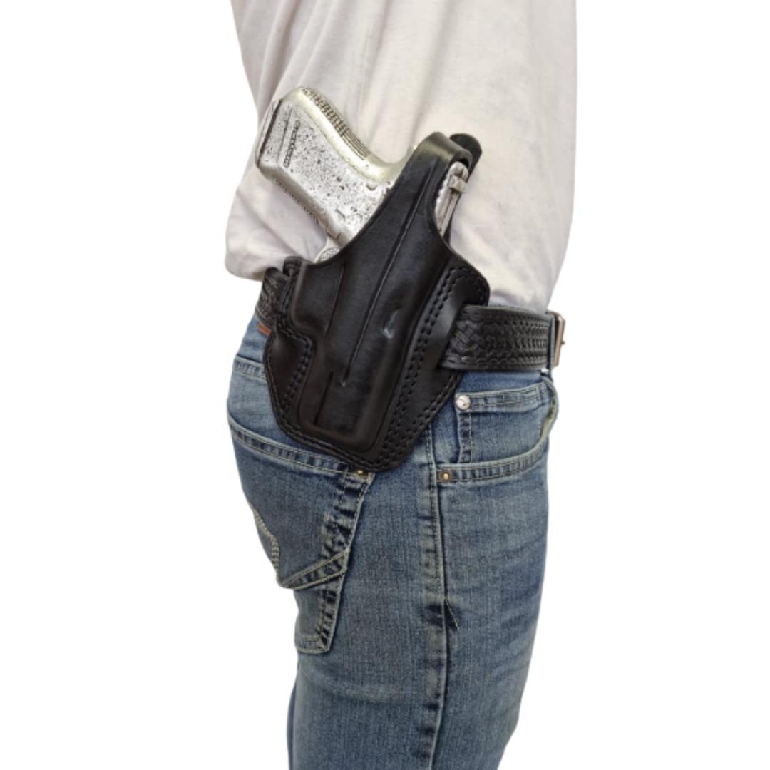 A closed-bottom holster is ideal for dusty conditions and a retention strap secures the firearm in the holster and allows the carrier of the gun to walk, run, climb or jump without caution. The carrier of the holster will use their thumb to release the retention strap (also called the thumbreak), this adds additional protection to the firearm as no passerby can release the strap.