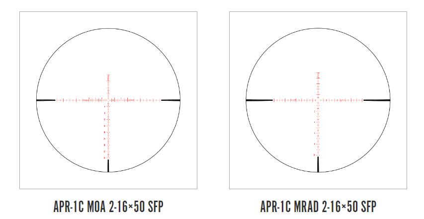 APR stands for “All-Purpose Reticle”, and that’s the concept behind the design of the APR C & D variants. The “C” is the “clean”, or simpler of the two, with fewer markings than the “D” variant. The fine centre dot provides a precise aim point, and hash marks every 0.5 and 1 MRAD allow for easy holds.