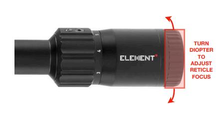 Everybody’s eye is different, and the ocular lens will need to be adjusted for your eye in order for the reticle to appear in focus. To do this, point the riflescope towards a blank or featureless background (i.e. a white wall or blue sky) and turn the ocular adjustment ring clockwise and counter-clockwise until the reticle appears in optimum focus.