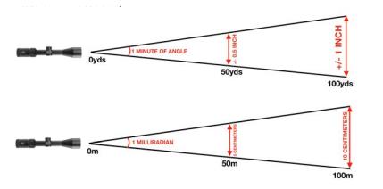 In simple terms, ONE MRAD = 10cm at 100m, and ONE MOA = 1.047” at 100yds. This makes these two units very useful, because we can relate them to units of measurement we use every day.