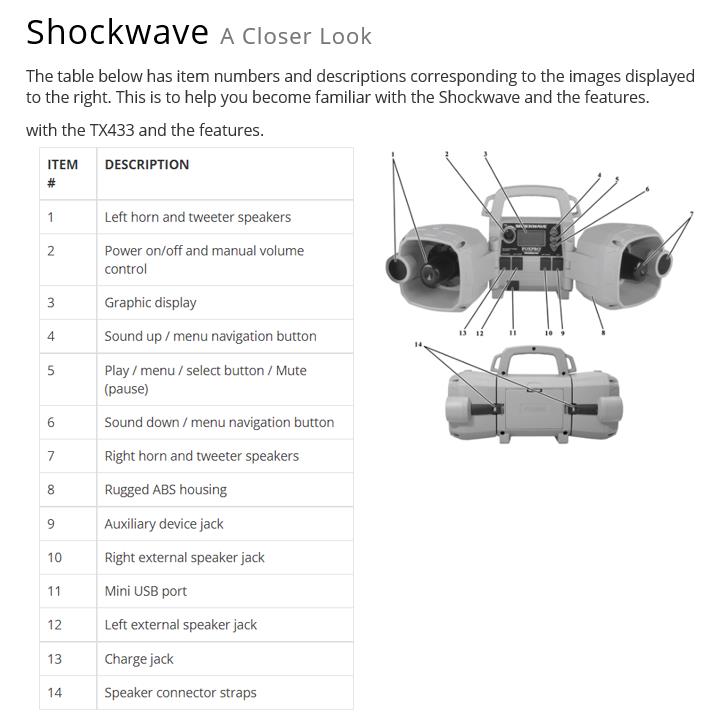 FOXPRO has set the bar, once again, with the SHOCKWAVE! This four speaker system has two horn speakers and two tweeters for excellent sound quality and volume capability. There are 2 external speaker jacks if you desire even more volume, an auxiliary jack to connect an approved device such as a Jack Predator Decoy, and a charge jack.