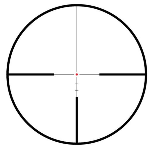 The LR Dot reticle was developed around a typical centrefire trajectory, like the .308 Winchester round, which is popular around the world for shooting fairly large game. It also suits some of the faster bullets that might be used for hunting foxes and similar quarry. Many hunters like to use the same magnification for the rifle scope as their binoculars so the LR Dot reticle markings were designed at 8x magnification. This design also makes it suitable for European shooters who might prefer a metric set of figures and therefore to zero their rifle in for 100 metres on the centre crosshair and use the lower aim points for 200, 300, 400 and 500 metres. A useful tip: at 8x magnification, the thick posts to the right and left of the centre dot would bracket the body length of a Roe deer at 100yds; a popular sized animal to hunt with this type of reticle.