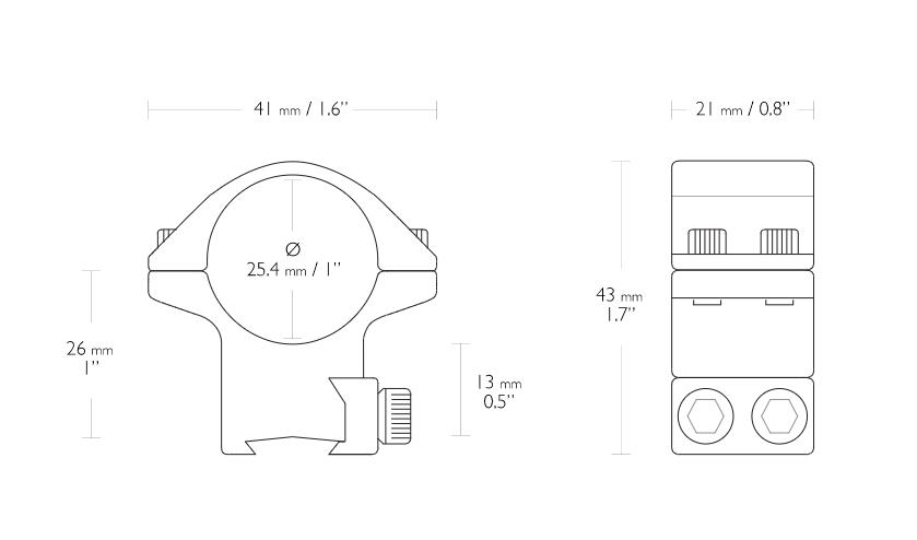 Designed to attach riflescopes with a 1" maintube to a 9-11mm or 3/8" mounting system, this Match Mount from Hawke Sports Optics features a two-piece anodized aluminum alloy design along with a medium profile that positions the center of the scope 1.0" above the mount. The scope is secured in place with double hex screws and internal cushion tape prevents marking or damage to the scope's exterior. A retractable recoil stop pin is also integrated into the design to maintain the scope's position during use.
