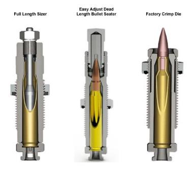 Lee PaceSetter Dies include the exclusive Lee Factory Crimp Die to produce factory-like ammunition with improved utility and accuracy. The die set also includes an easy adjust dead length bullet seater.
