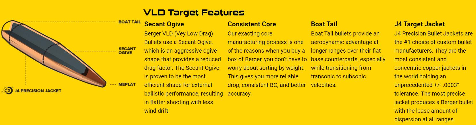 The Berger VLD Target Rifle Bullet is one of the flattest shooting Rifle Bullets on the market today. Emulated by all others, the VLD Target Rifle Bullet incoporates a secant ogive design which allows the Rifle Bullet to experience less drag as it travels to the target. This reduced drag is why the VLD shoots flatter, experiences less wind-drift, and has a higher retained velocity than all others. A favorite load technique for the VLD’s is touching the rifling for single-shot applications, although some rifles may prefer as much as .150″ from the rifling. Berger VLD Target Rifle Bullets are extremely popular for competitive long range applications. Built with highly consistent J4 Precision Rifle Bullet jacket, most favored by custom Rifle Bullet makers.