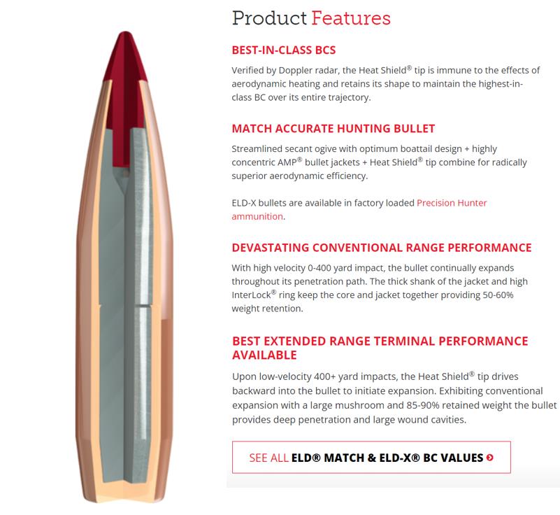 The ELD-X® (Extremely Low Drag - eXpanding) bullet is a technologically advanced, match accurate, ALL-RANGE hunting bullet featuring highest-in-class ballistic coefficients and consistent, controlled expansion at ALL practical hunting distances.