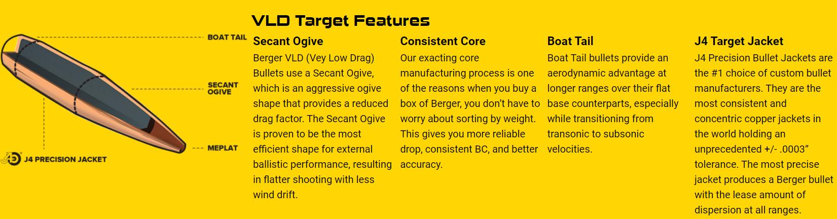 The Berger VLD Target Rifle Bullet is one of the flattest shooting Rifle Bullets on the market today. Emulated by all others, the VLD Target Rifle Bullet incoporates a secant ogive design which allows the Rifle Bullet to experience less drag as it travels to the target. This reduced drag is why the VLD shoots flatter, experiences less wind-drift, and has a higher retained velocity than all others. A favorite load technique for the VLD’s is touching the rifling for single-shot applications, although some rifles may prefer as much as .150″ from the rifling. Berger VLD Target Rifle Bullets are extremely popular for competitive long range applications. Built with highly consistent J4 Precision Rifle Bullet jacket, most favored by custom Rifle Bullet makers.