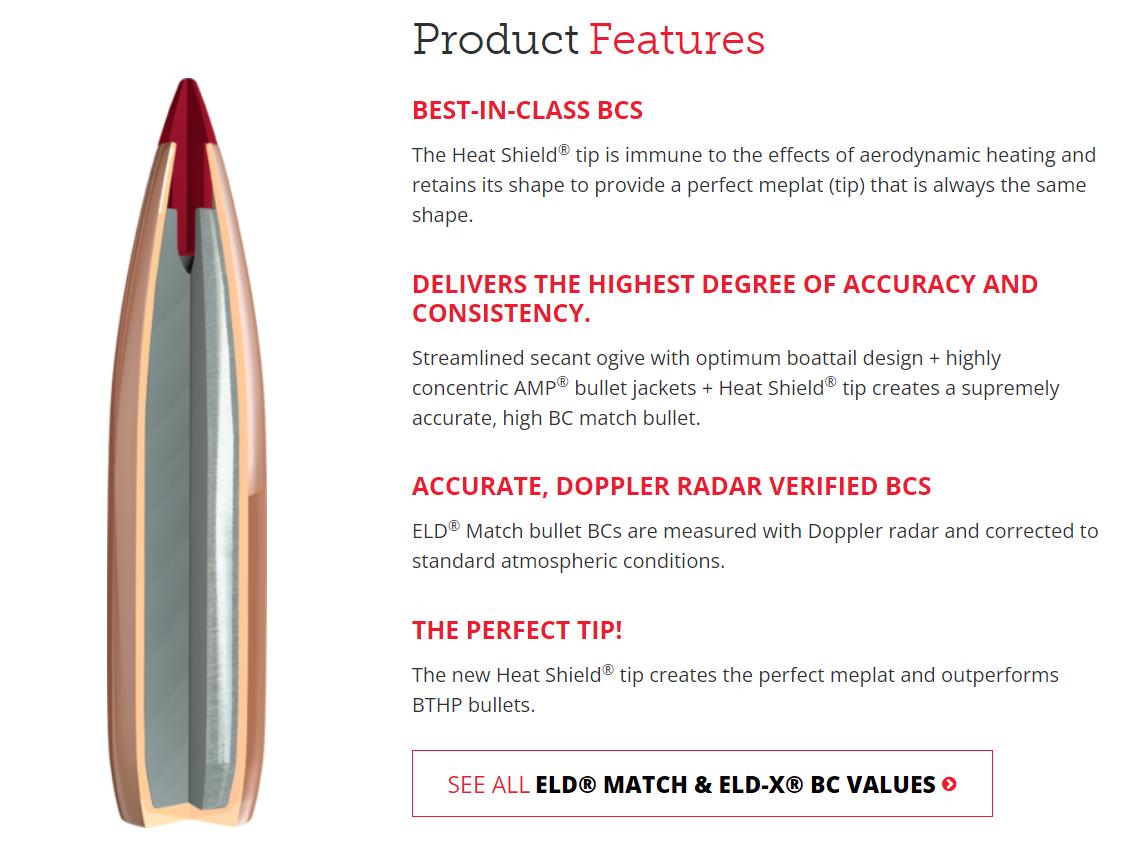 ELD® Match (Extremely Low Drag Match) bullets are technologically advanced, enhanced accuracy target bullets featuring Heat Shield® tips with the PERFECT MEPLAT (tip point) combined with numerous design features that deliver the highest-in-class ballistic coefficients, superior accuracy and extreme consistency from bullet to bullet, lot to lot.