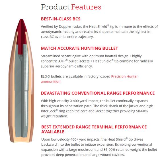 The ELD-X® (Extremely Low Drag - eXpanding) bullet is a technologically advanced, match accurate, ALL-RANGE hunting bullet featuring highest-in-class ballistic coefficients and consistent, controlled expansion at ALL practical hunting distances.
