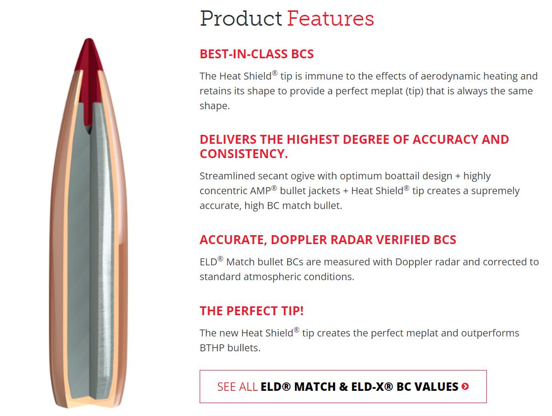 ELD® Match (Extremely Low Drag Match) bullets are technologically advanced, enhanced accuracy target bullets featuring Heat Shield® tips with the PERFECT MEPLAT (tip point) combined with numerous design features that deliver the highest-in-class ballistic coefficients, superior accuracy and extreme consistency from bullet to bullet, lot to lot.