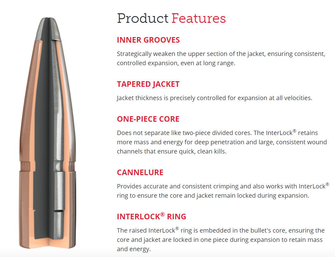 Our traditional line of bullets feature exposed lead tips for controlled expansion and hard-hitting terminal performance. Most have our pioneering secant ogive design — one of the most ballistically efficient profiles ever developed (see diagram to right). Most feature our exclusive InterLock® design — a raised ring inside the jacket that is embedded in the bullet's core that keeps the core and jacket locked together during expansion to retain mass and energy.