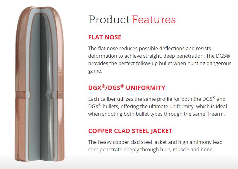 The business end of the DGS® bullet features a wide, flat nose that delivers maximum energy upon impact, while resisting bullet deformation and deflection. Incorporating a very hard high antimony lead core with a copper-clad steel jacket, this bullet maintains integrity and overall weight retention when driving through even the toughest hide and bone. Uniform in shape and size to the DGX® (Dangerous Game™ eXpanding) bullet, you can reliably and accurately shoot both from the same firearm with little to no shift in point of aim or impact.