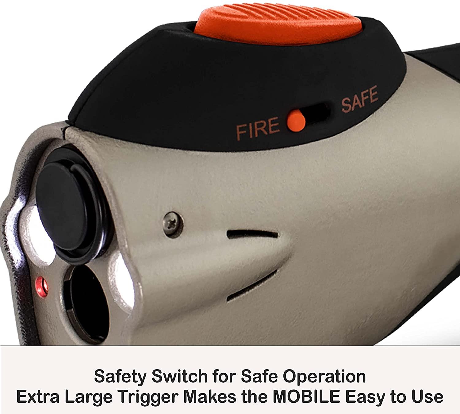 Equipped with an easy-to-use large trigger, dual-LED flashlight, and aiming laser, the mobile is perfect for home protection, walking at night, or storing in smaller spaces on the go such as a glove box or backpack. Powered by compressed air, the mobile has no recoil and is easy to load and operate.