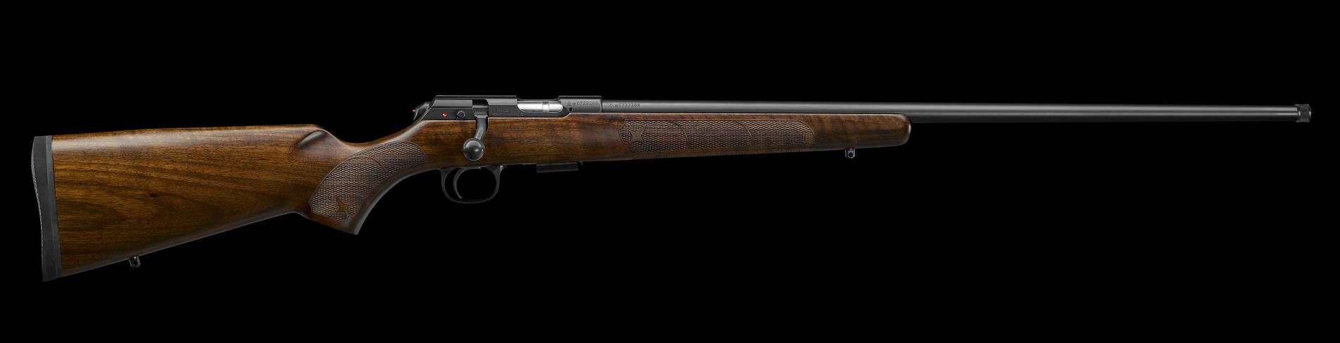 The CZ 457 American is the perfect example of a classic American sport and hunting gun. The varnished American-style stock is made from high quality walnut, with checkering on the grip that incorporates a fleur-de-lis motif. The light profile, cold hammer forged barrel is 630 mm long and has no sights.