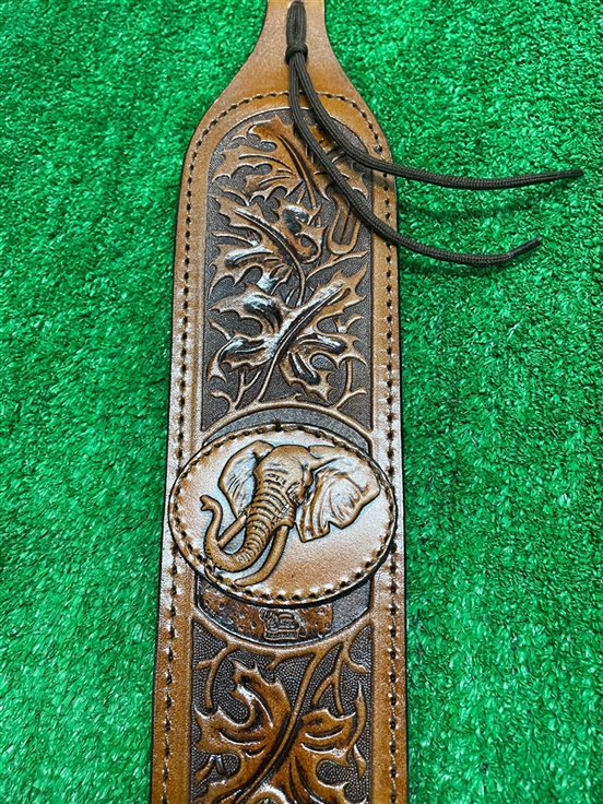 A true hunters sling made from top grade hide and suede lined. Full 3″ wide at the shoulder it tapers to fit 1″ swivels, featuring a thumb hole. This sling has a disk on it of a elephant's head. It is also available with the other big five animal head disks or the big five family leather disks.