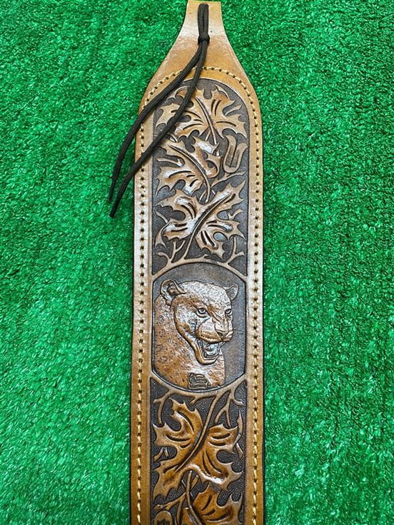 A true hunters sling made from top grade hide and suede lined. Full 3″ wide at the shoulder it tapers to fit 1″ swivels, featuring a thumb hole.