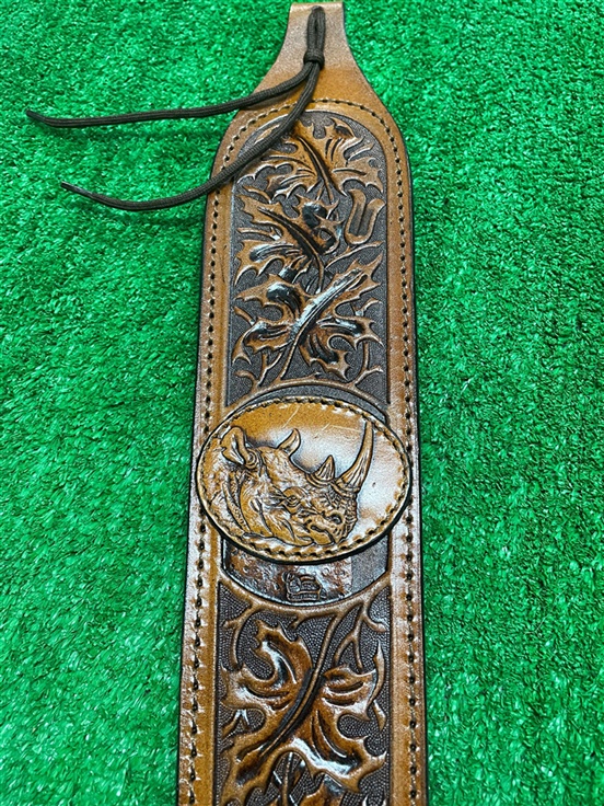 A true hunters sling made from top grade hide and suede lined. Full 3″ wide at the shoulder it tapers to fit 1″ swivels, featuring a thumb hole. This sling has a disk on it of a rhino's head. It is also available with the other big five animal head disks or the big five family leather disks.